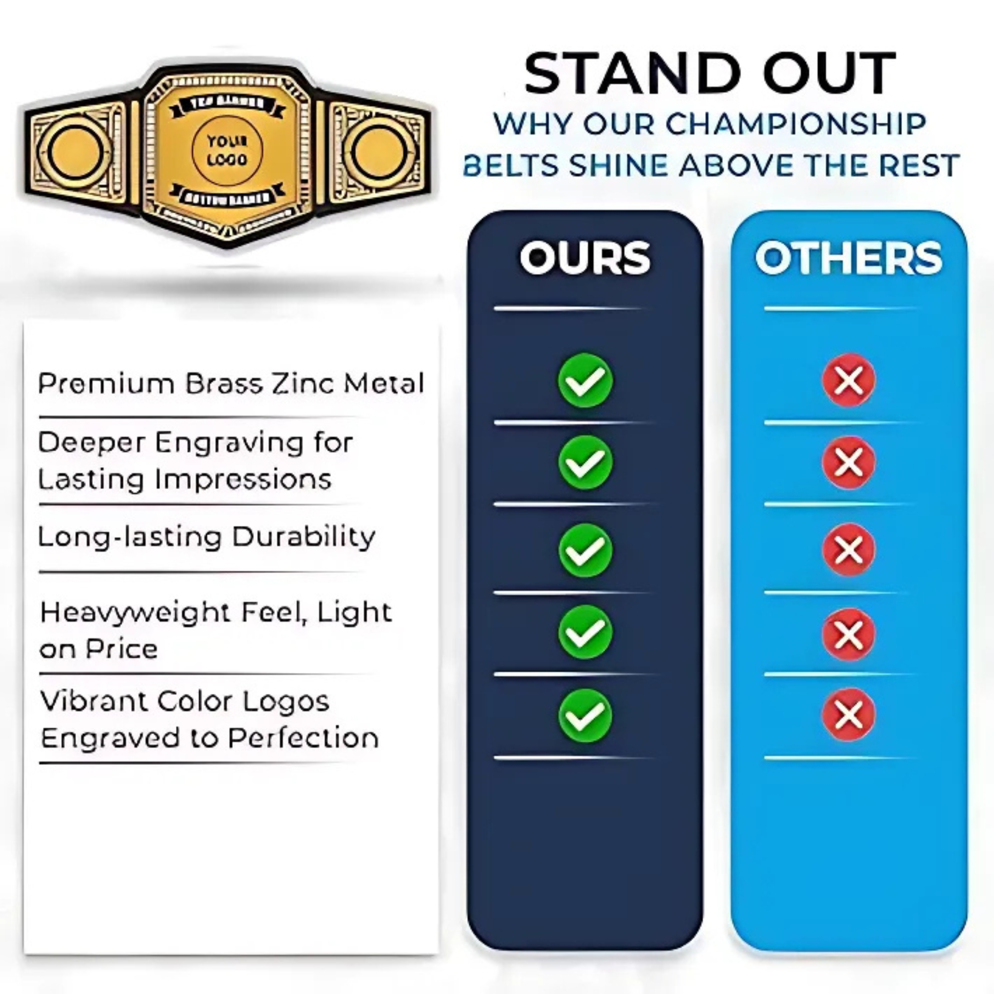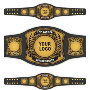 Our custom logo championship belt boasts of solid cast alloy plates, which are beautifully plated in gold, reflecting the light in the right way. The 6-pound weight makes it feel like it’s championship weight, and the high-end synthetic leather strap with twice-stitched edges makes it feel like it is constructed to withstand multiple triumphs.