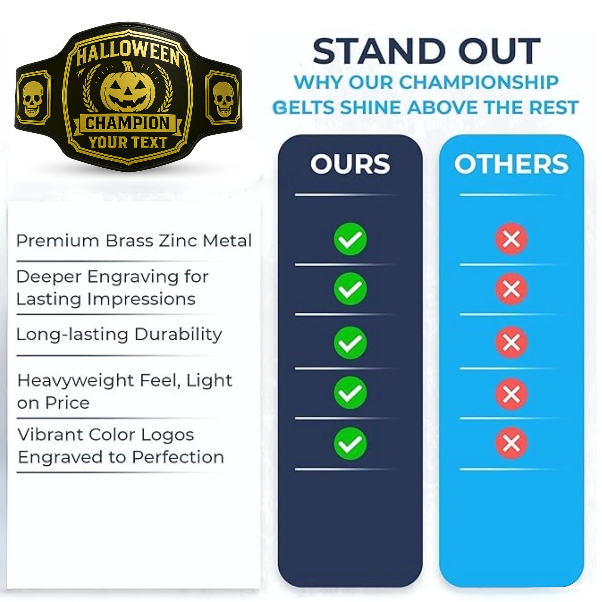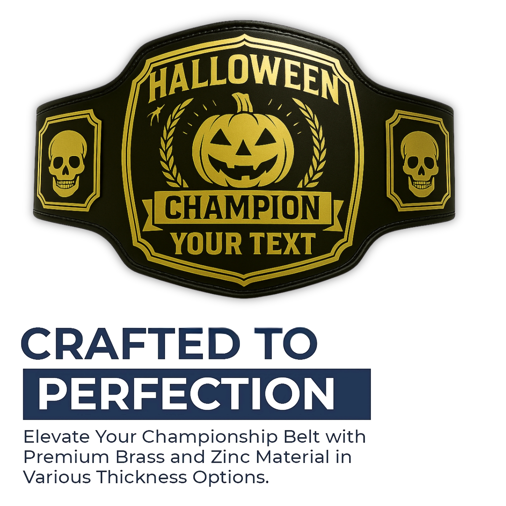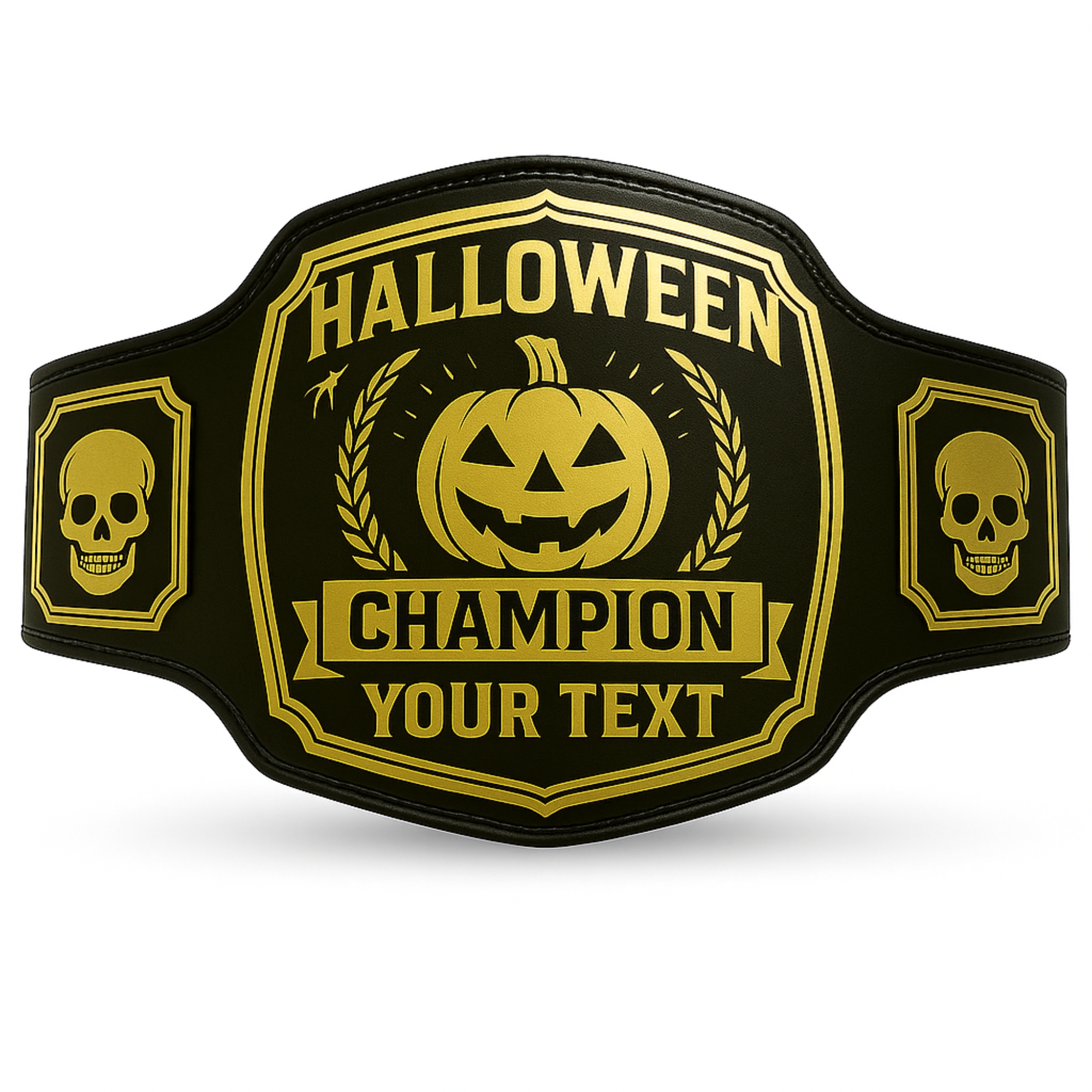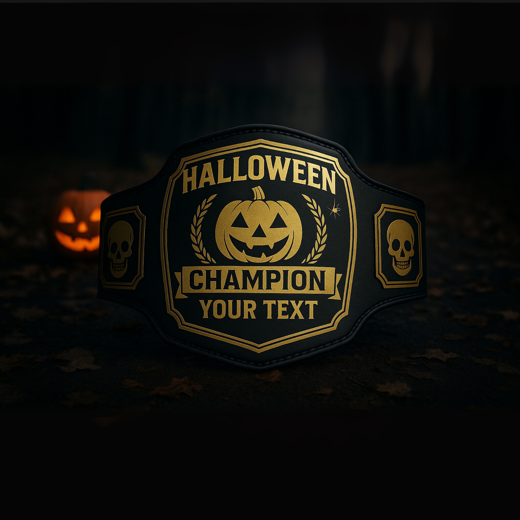 The real magic? Complete customization. Transform the large center plate and side plates with your logos, text, or spooky designs. Whether you’re crowning the scariest costume, best pumpkin carver, or ultimate Halloween party host, this belt becomes your personal masterpiece. Call us today and find out how our personalized Halloween championship belt can bring your designs into reality.