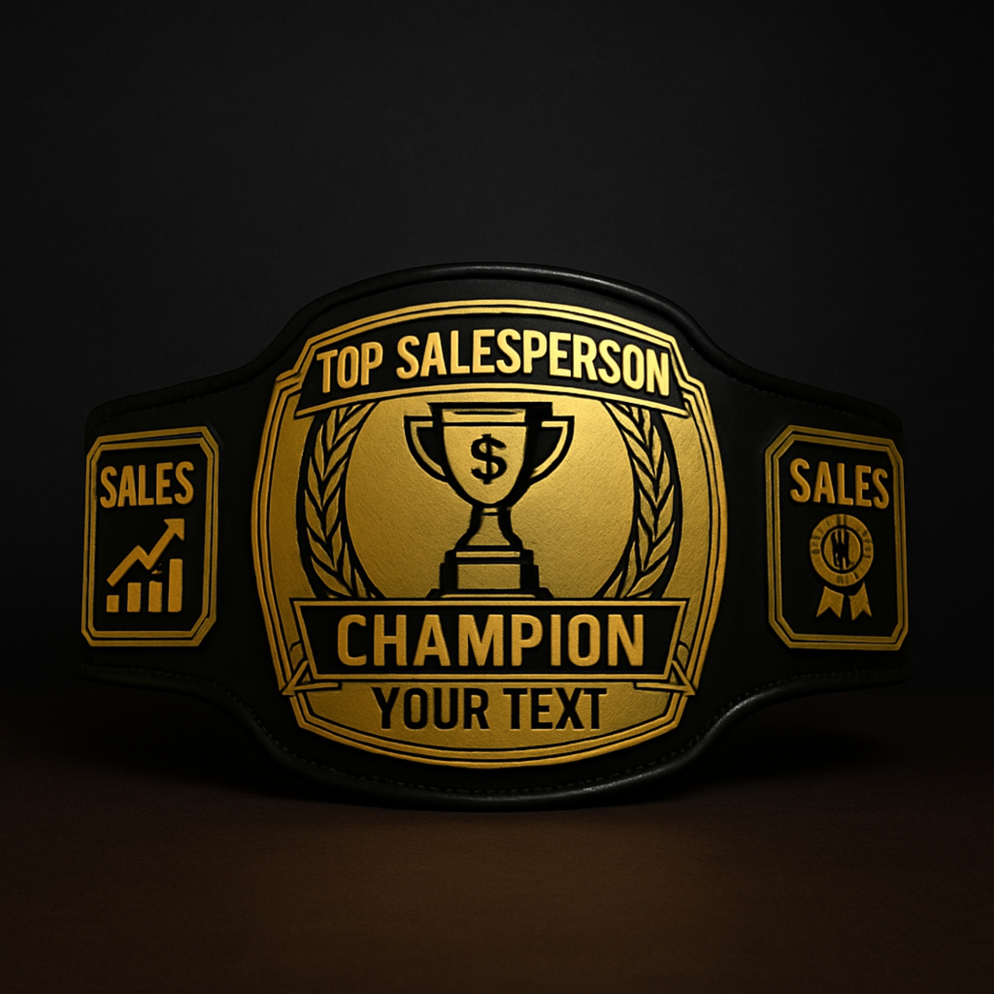 Reward the ultimate winner with this Belt of Championship. The Belt is crafted out of deep French Gold Plating of the metal plates and colorful customization of your logos and text. Our belts are not generic, corporate, or cookie-cutter in taste and look.